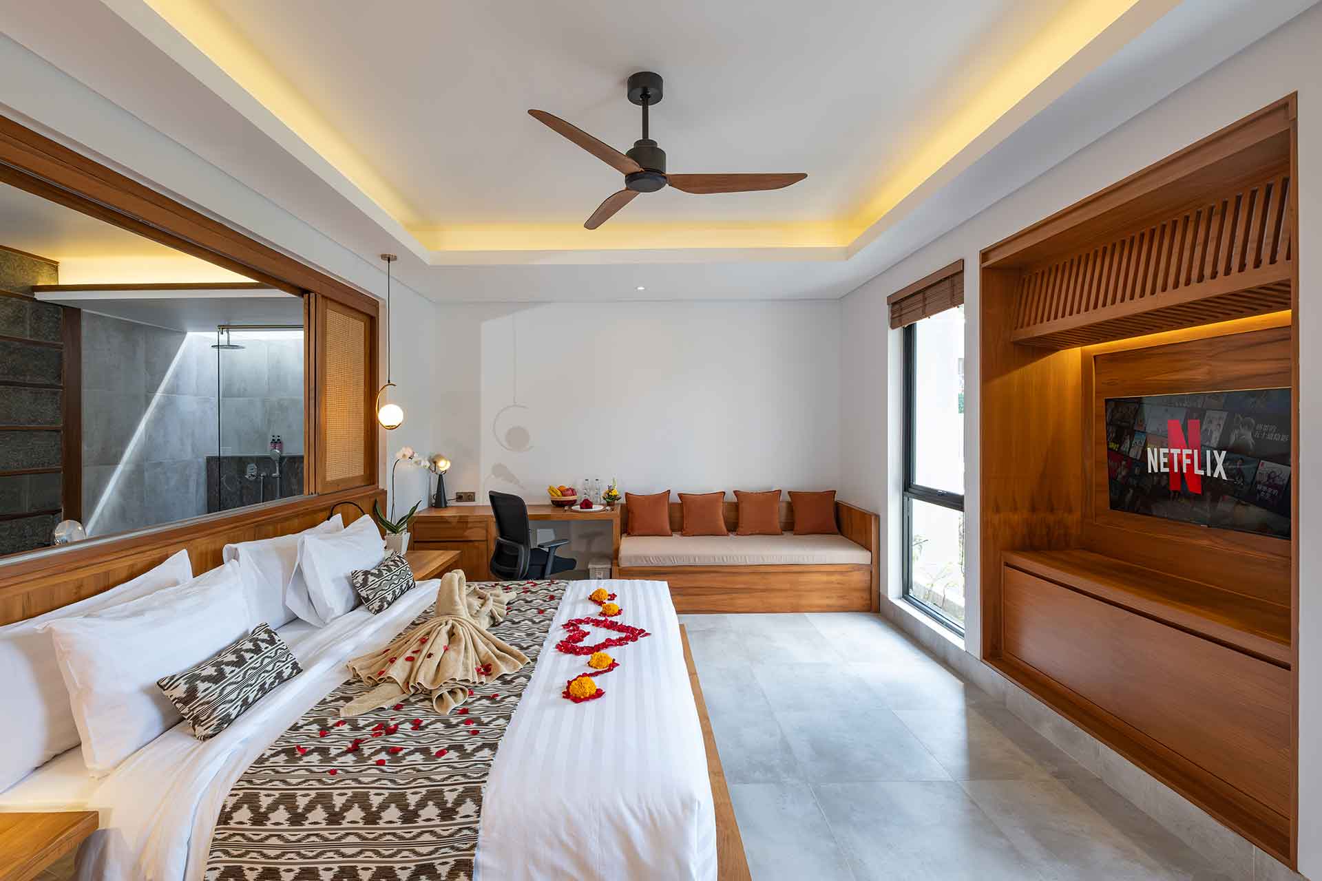 Spanning over 200 sqm, the Grand Two Bedroom Pool Villa is inspired by traditional Balinese courtyard homes, where indoor elegance blends seamlessly with Canggu’s distinctive open-air lifestyle.